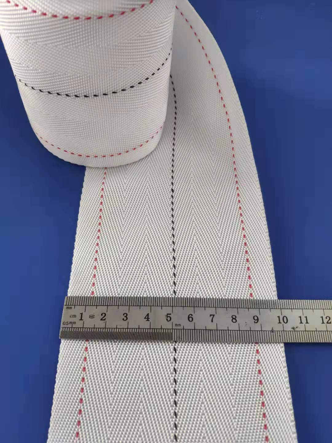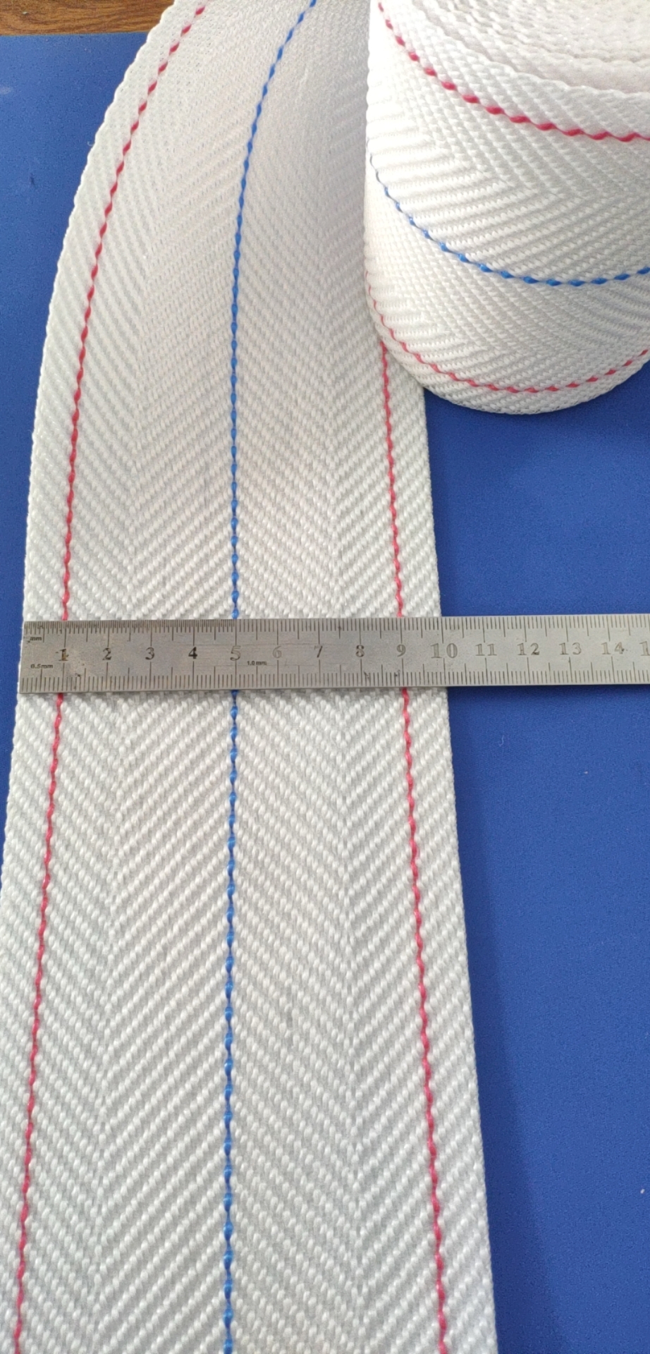 常規規格:寬度:100mm, 長(cháng)度根據要求定制。顏色為白色底色,中間一條藍色線(xiàn),兩邊可加紅色線(xiàn)。